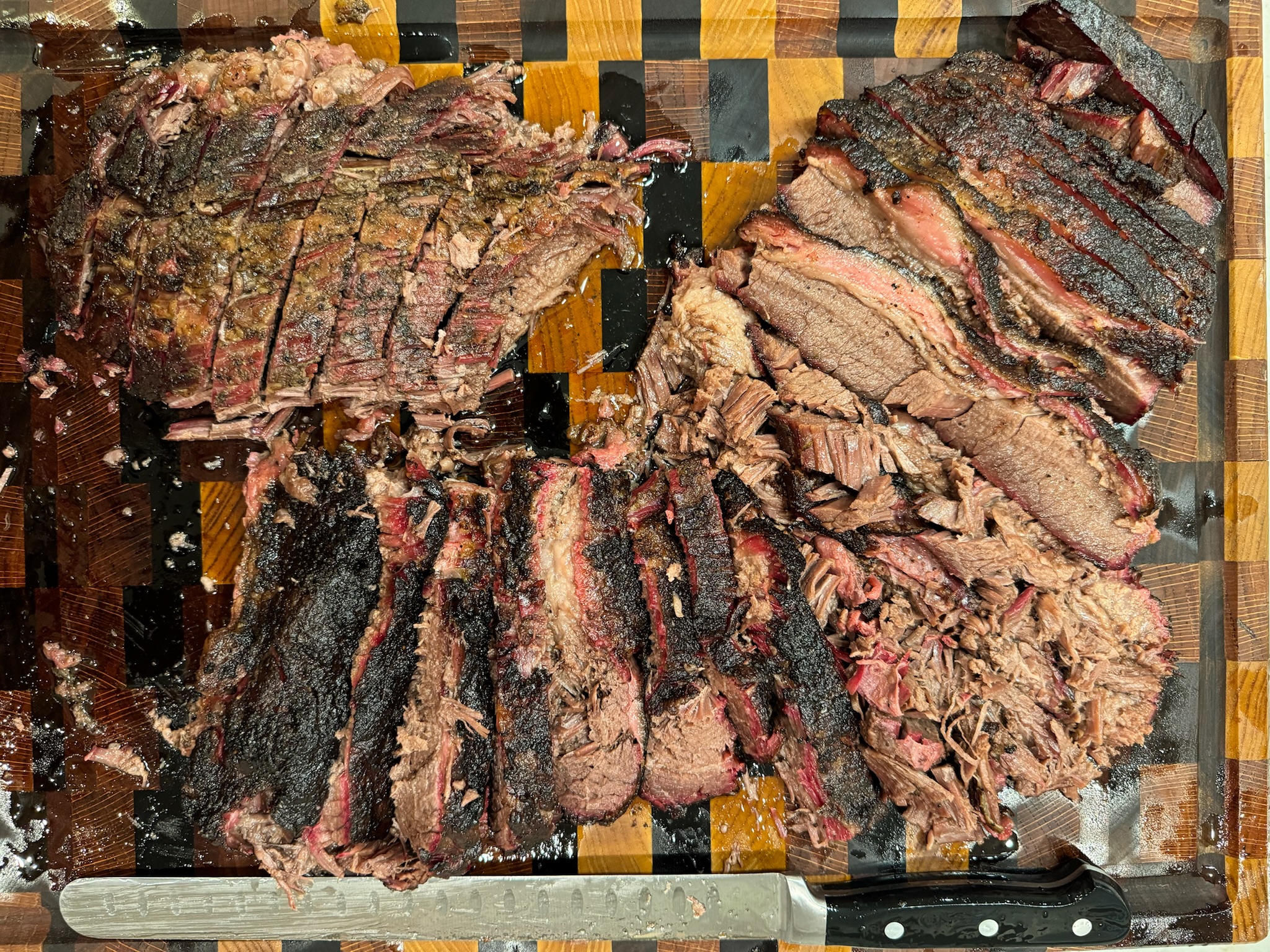To serve, slice the flat against the grain until you reach the point. Then, either separate the flat from the point or rotate the brisket 90 degrees to continue slicing.