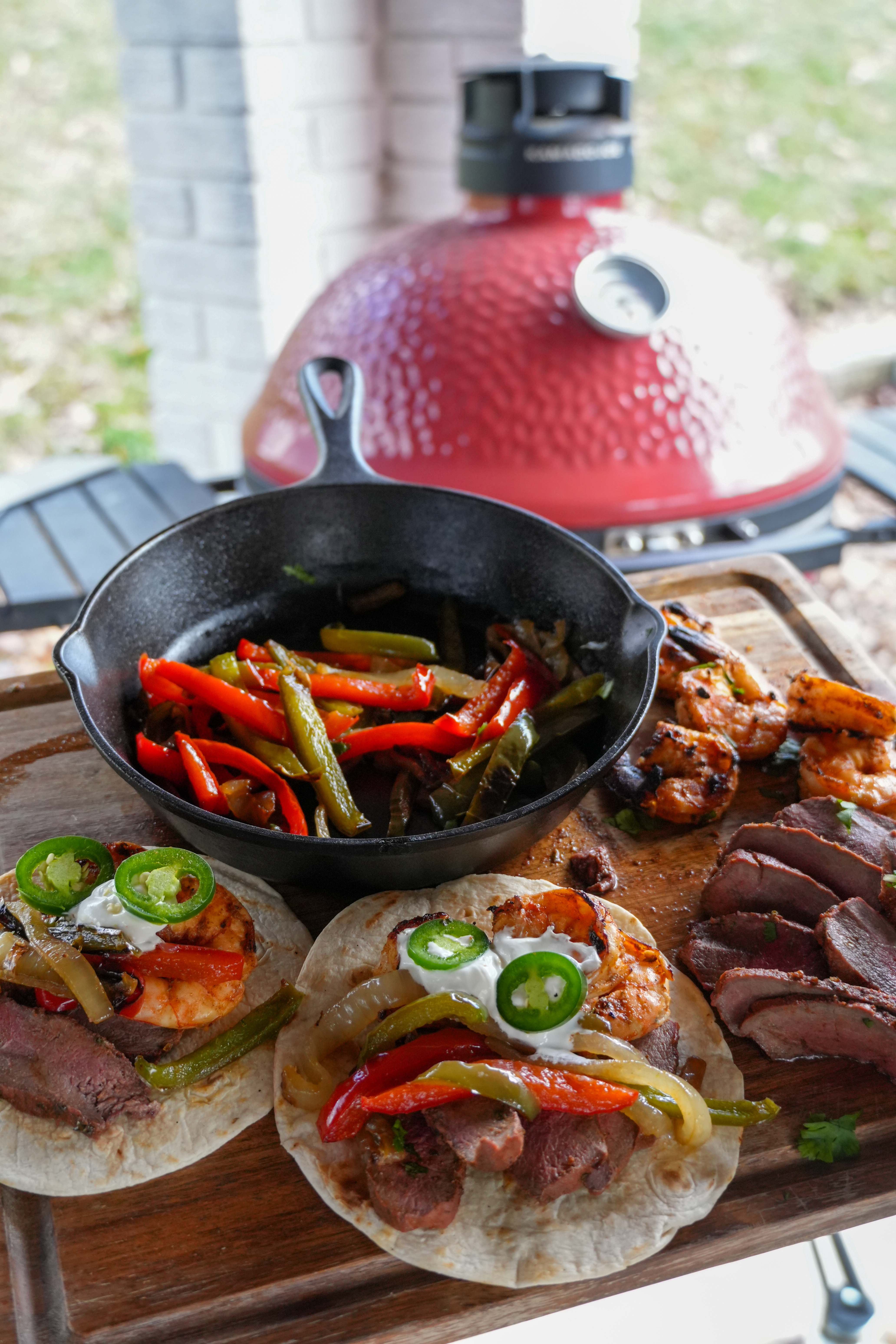 Add the oiled veggies to the hot cast iron skillet on the grill. Stir occasionally for 8–12 minutes until charred, softened, and smoky. Remove and keep warm (cover with foil).