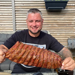 Low and slow, no wrap, pure smoke. These ribs skip the foil crutch and rely on consistent heat, periodic mopping, and a final BBQ sauce glaze to deliver fall-off-the-bone tenderness with bark that actually stays intact. Using a rib rack maximizes your Kamado Joe's space, letting you smoke multiple racks at once without compromising airflow or smoke penetration.