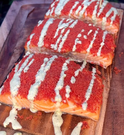 Bring bold heat and next-level texture to your next cookout with this Takis Crusted Salmon made on the Kamado Joe Konnected Joe. The spicy crunch of Takis Fuego pairs perfectly with the smoky cedar-planked salmon, while a cool cilantro sauce adds balance and brightness. This unique salmon recipe delivers restaurant-worthy flavor with a fun twist—perfect for adventurous foodies and spice lovers.