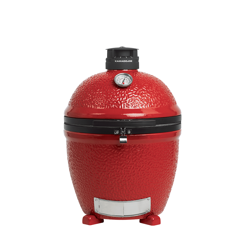 A red standalone Classic Joe II grill with chrome draft door at the bottom of the base, black metal bands with latch where the grill body and lid meet, a thermometer in the top of the lid, and a Kontrol Tower top vent.