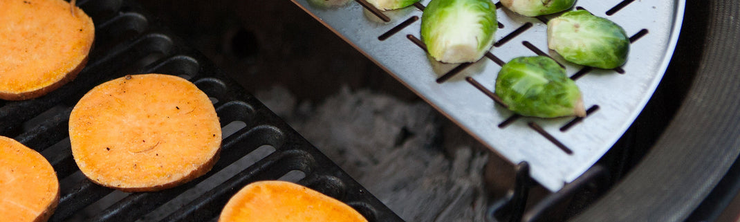 Sliced sweet potatoes cook on a cast iron half-moon grate while brussel sprouts cook on the stainless steel vegetable grate