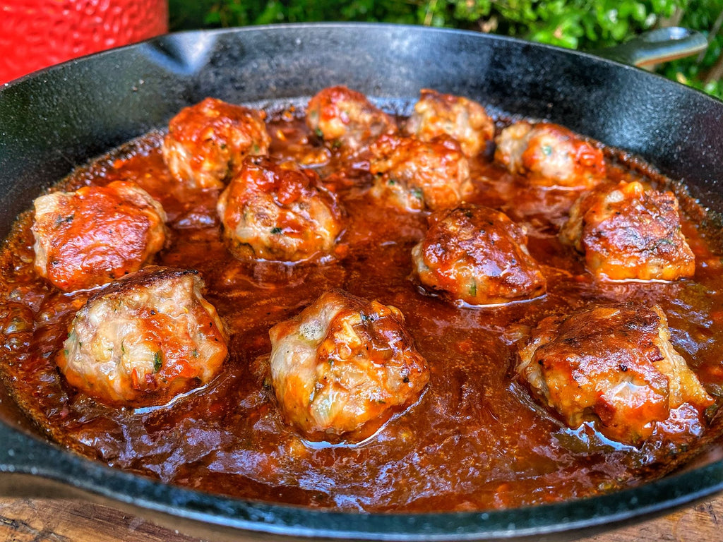 Place a clean cast iron pan on the grill surface and allow it to come to temperature. Oil the pan and bring it to smoking point. Sear the meatballs evenly on all sides then pour the BBQ sauce over top of the meatballs. Use enough sauce to reach ¼” below the top of the meatballs. Close the dome and cook the meatballs until they reach an internal temp of 155F. Gently turn a few times throughout the cook, be sure not to break the meatballs. Remove from the grill and serve from the skillet.