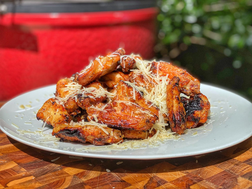 Flip the wings and manage the color and caramelization as you do so. Remove the sauce from the heat. Close the dome and cook for another 20 minutes. As the smaller wings are done before the larger, begin to stack them in the center of the grill and treat them as a lager roast, allowing them to come to temperature together.