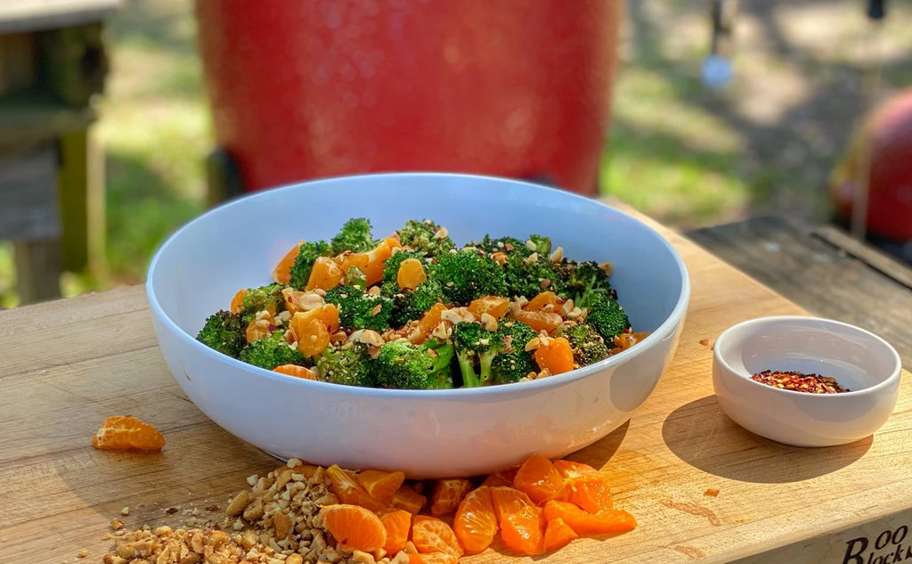 Toss the broccoli florets with the marinade and place them stem side down on the grill grate above the half-moon deflector shield. Pour the remaining marinade over the top of the florets. Season with Q-Nami.