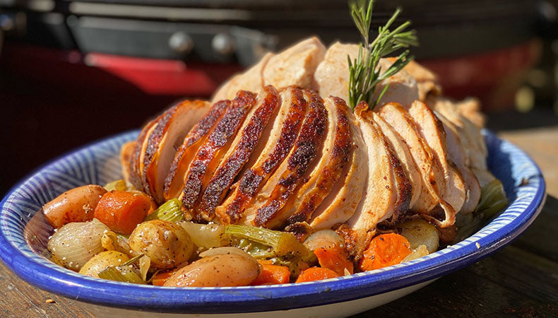 Remove the tray from the grill and take the turkey off the vegetables; allow the bird to rest for 20 minutes. Taste a few of your vegetables and season with the Lane's BBQ rub, then transfer the roasted vegetables to the presentation plate and keep warm.