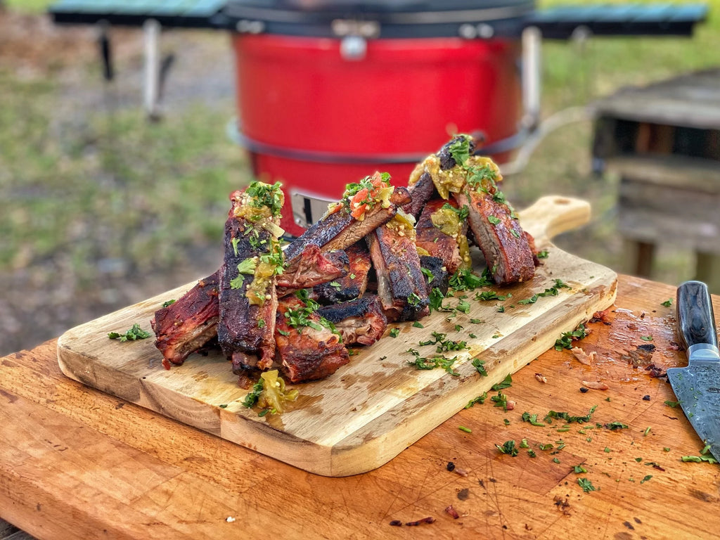 Rip 3 sheets of foil, 1 for each portion of rib, pour ½ cup of Chile Verde Salsa in the center and top with the rib section facing meat side down. Fold the foil over creating 3 individual pouches and replace back on the indirect side with the salsa facing downward and cook for 45 minutes to 1 hour. Check at the 30-minute mark to make sure the ribs and salsa are not getting too dark.